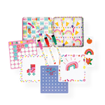 Contains 6 activities in one tin: Snakes & Ladders, Tic Tac Toe, Pixel Art, 4 in a Row, Dots & Boxes, and a doodle page