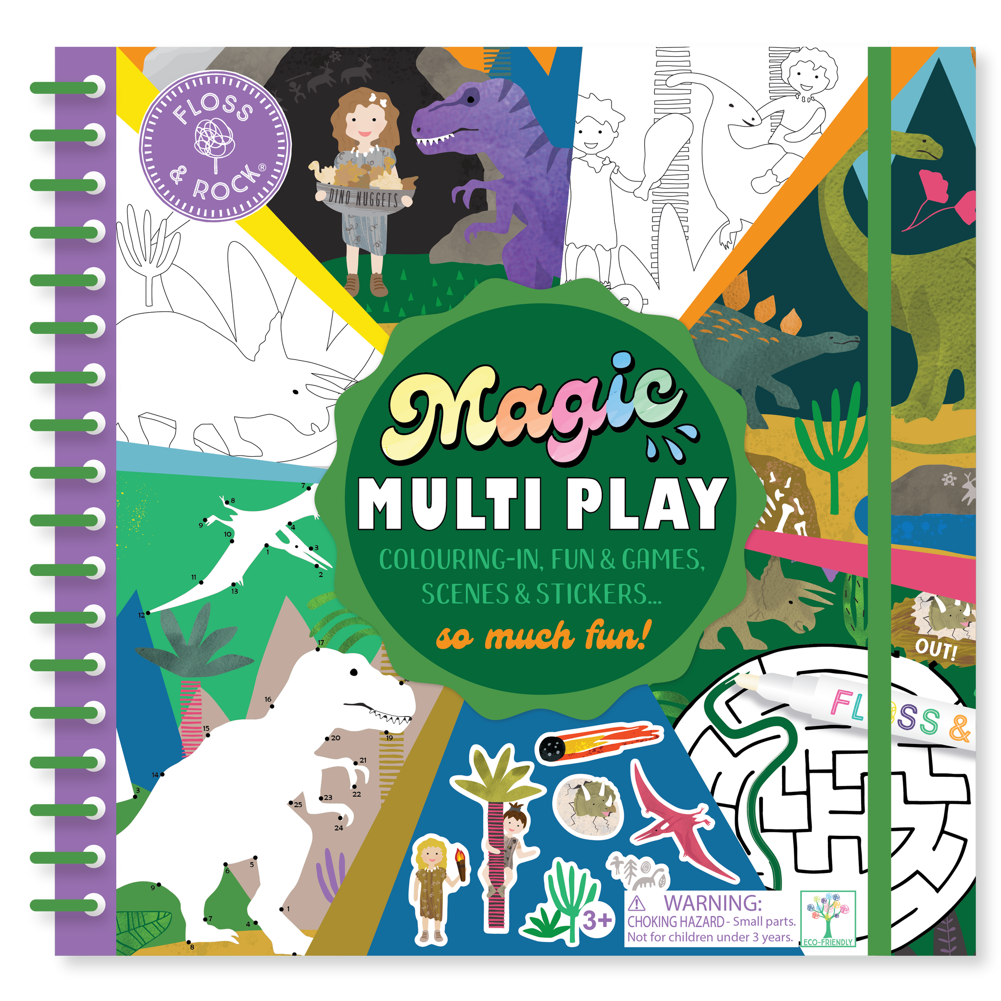 Get ready for a prehistoric adventure with the Magic Multi Play Activity Book – Dinosaur, a reusable, eco-friendly activity set designed to keep children aged 3 years and up engaged, learning, and having fun. Packed with 16 exciting activities, this spiral-bound book features colouring pages, dot-to-dots, mazes, matching games, reusable stickers, and more—all themed around friendly dinosaurs, cavemen, and erupting volcanoes.