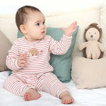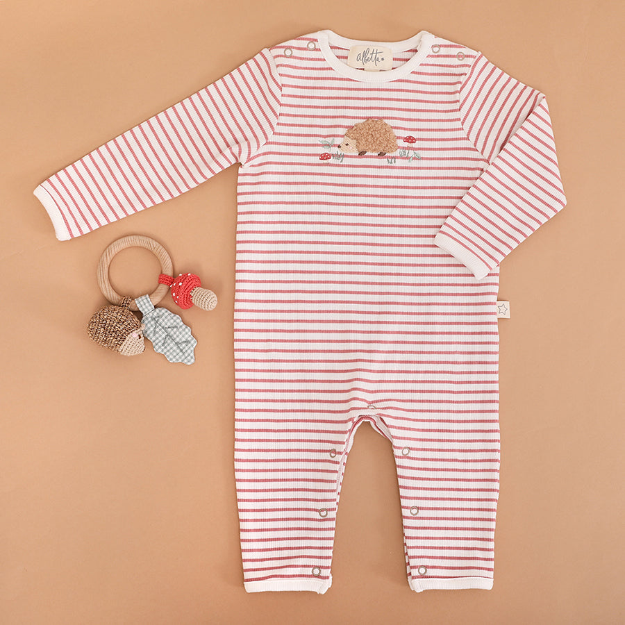 Made from a soft terracotta striped organic cotton, this babygro features our sweet applique Henri Hedgehog with tactile boucle fur. Surrounded by intricately embroidered cute little toadstools and delicate pastel green leaves, our adorable babygro will make any little one smile. A beautiful soft chocolate brown picot lines the neck and cuffs adding our signature Albetta detailing. Our Albetta Henri Hedgehog Babygro is made from 100% sustainable organic cotton. Machine washable at 30°C.
