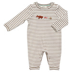 Our brand-new Albetta 'In the Wood' Embroidered Babygrow is sure to be a favourite this season. Designed in a premium chestnut-brown striped organic cotton, the babygrow features a beautifully embroidered Fox, Toadstool, and Henri Hedgehog characters from our Woodland collection. An intricate soft beige picot lines the neck and cuffs adding an Albetta signature touch.