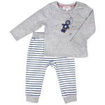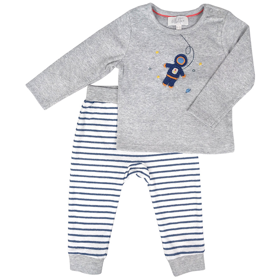 Brand new to this season, we are introducing an exciting space collection which is out of this world! This fun crochet astronaut playset compliments the other items in our collection, and is perfect for active little ones. Our beautiful set includes a ribbed grey marl cotton top, complete with the cutest little crochet astronaut, as well as matching navy and white organic striped trousers with a fun red tie detail to add a bold pop of colour. The matching cosy cotton bottoms let your little one move about easily and make this playset perfect for any bold and brave little explorer astronauts you may know! The top and bottoms are made from 100% organic cotton. Machine washable at 30°C.