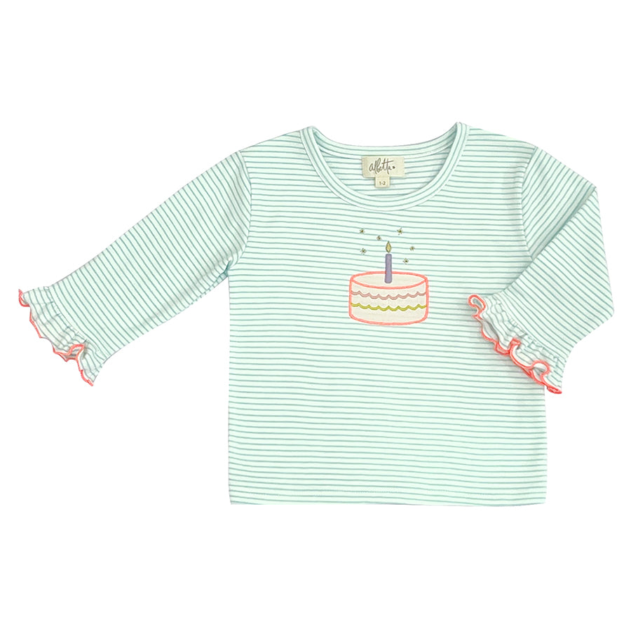 Albetta birthday cake t-shirt is the perfect way to celebrate your little one growing up! Made from the softest cotton, this playful stripey 3/4 sleeves t-shirt has a birthday cake on the front and a pretty ruffles around the sleeves.
