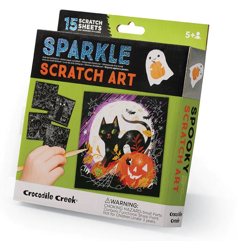 Scratch, sparkle, and create! These wonderful Halloween scratch-art activity sets are great fun for all little ghosts and goblins ages 3-8. They will delight in scratching the surface with the wooden stylus to reveal the colorful, sparkly Halloween designs. Halloween-themed illustrated sheets and one Halloween stencil sheet (16 pieces total).