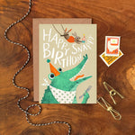 Happy Snappy Birthday card with crocodile and rabbit illustration. Suitable for both children and adults!