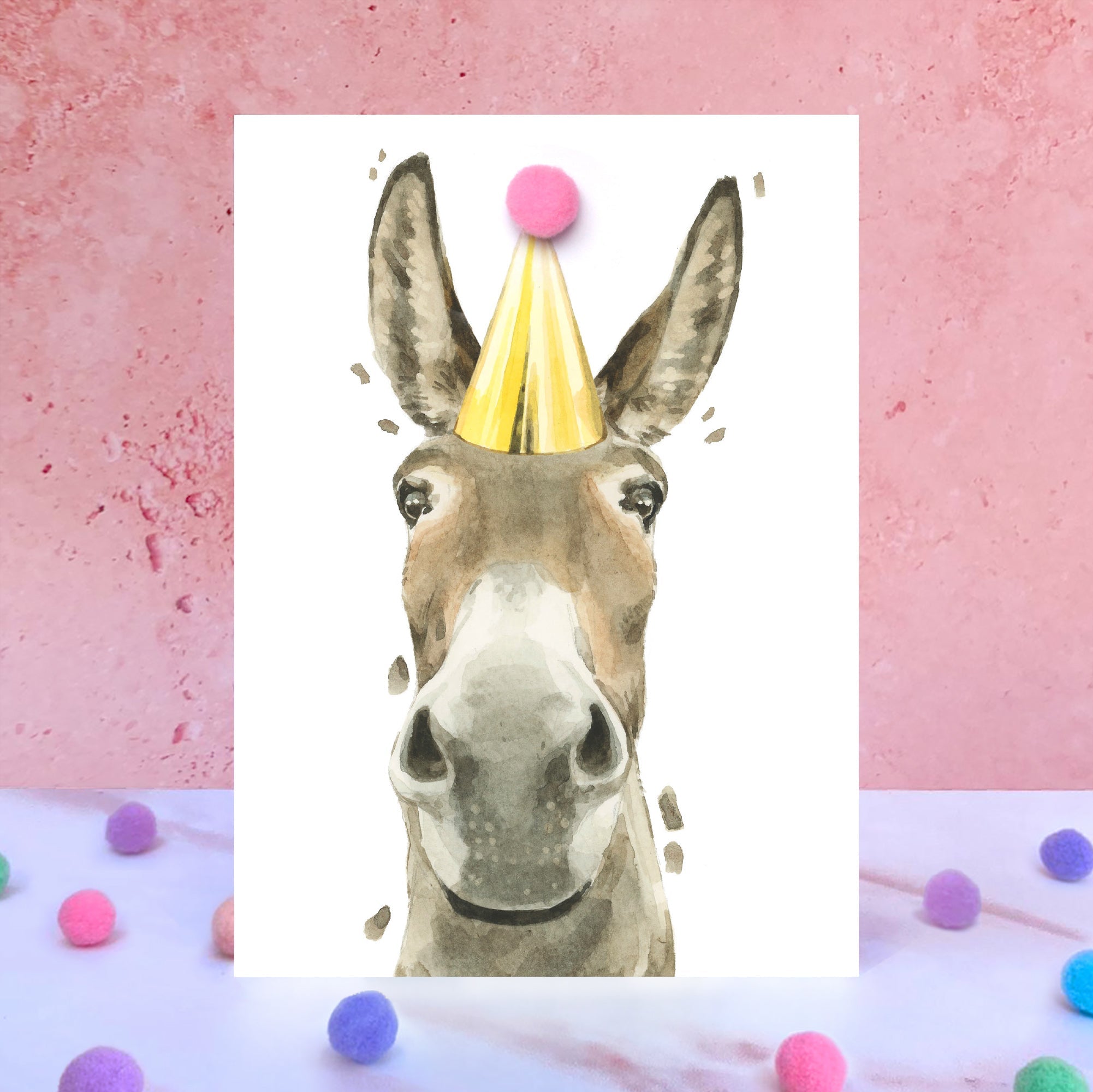 With an adorable velvety nose you could reach out and kiss, meet Sunny the Donkey! This beautiful, high-quality birthday card is the perfect way to brighten someone’s day. Featuring Sunny’s sweet expression and a playful 12mm pompom atop her party hat, this card is a must-have for any donkey lover celebrating a special occasion. Whether it’s a birthday or any event that calls for a little extra joy, this delightful card is sure to bring a smile!