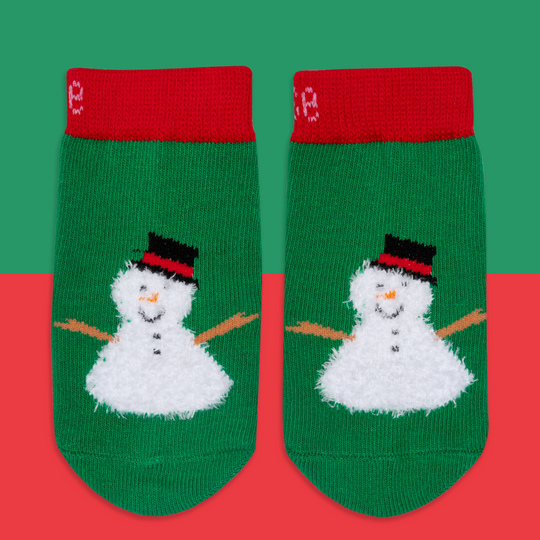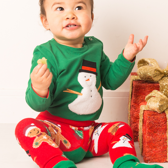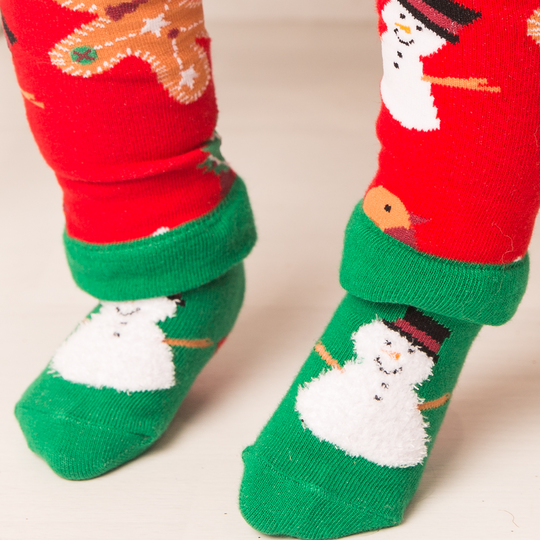 Red leggings with snowman pattern and 'Blade & Rose' branding on a green and red background