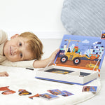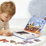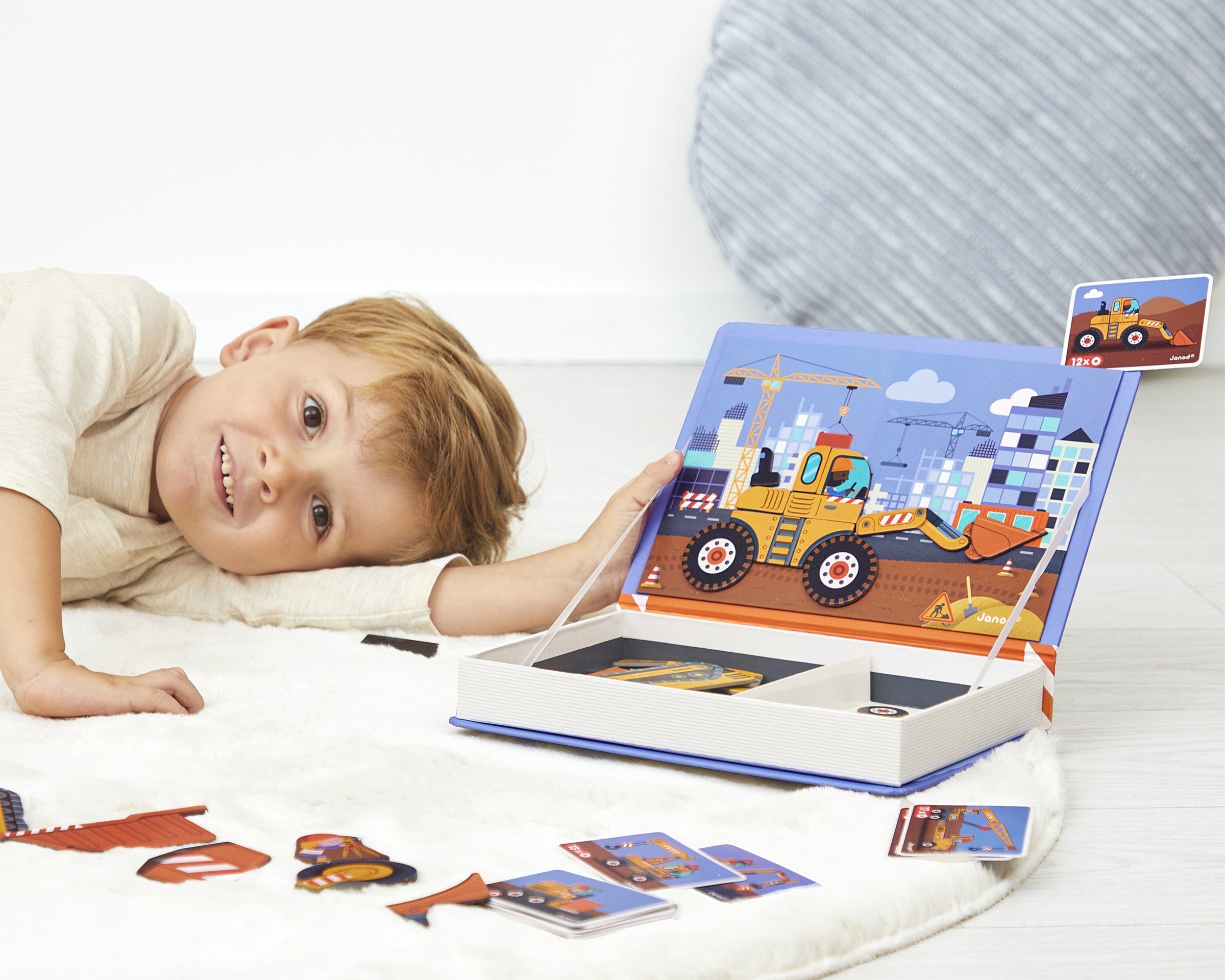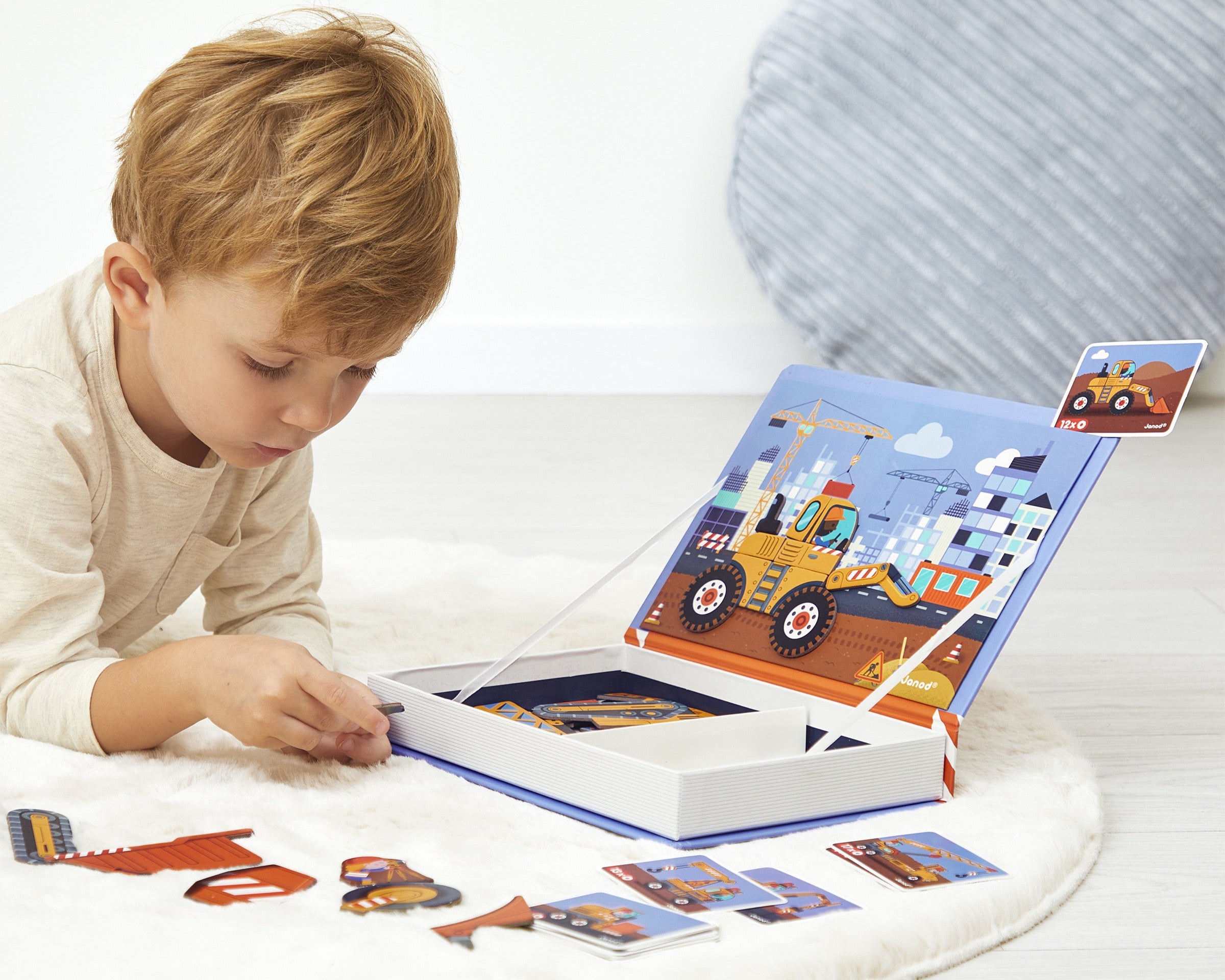 There’s a city to build and your little engineer is in charge! This exciting Magneti’Book construction set is perfect for children aged 3 and up who love diggers, cranes, and everything that whirrs, scoops, and lifts. Whether following one of the 18 model cards or mixing and matching their own designs, kids can create a whole world of machines with 50 chunky, easy-to-grasp magnets.