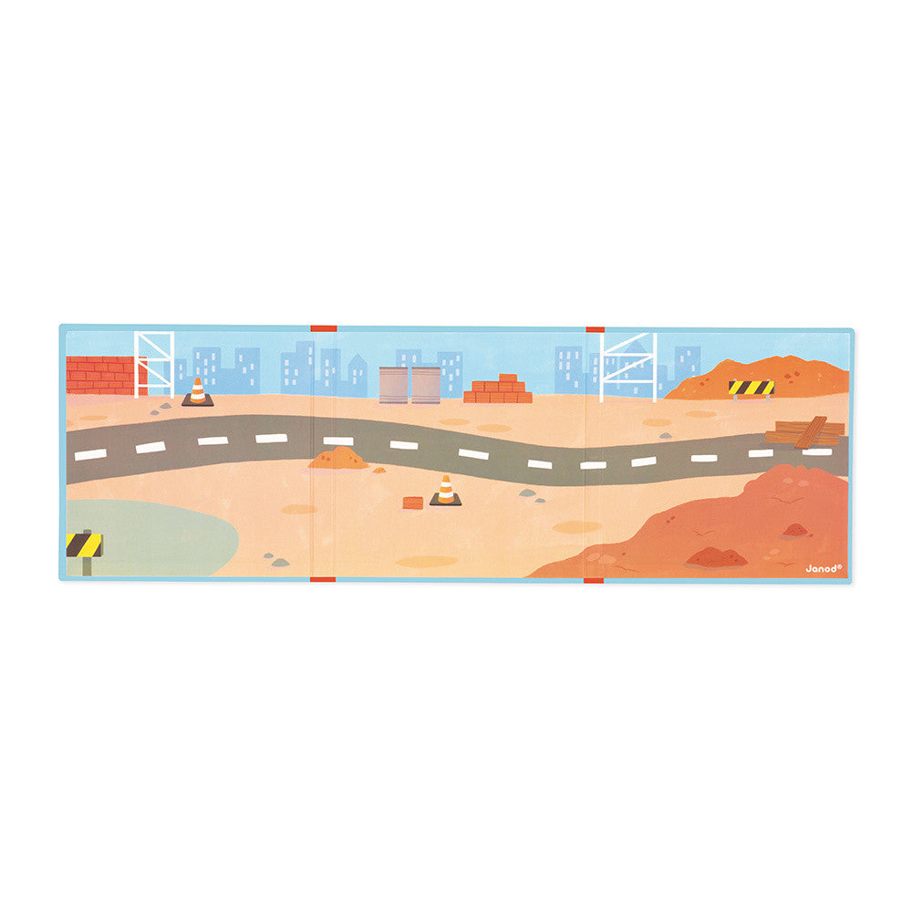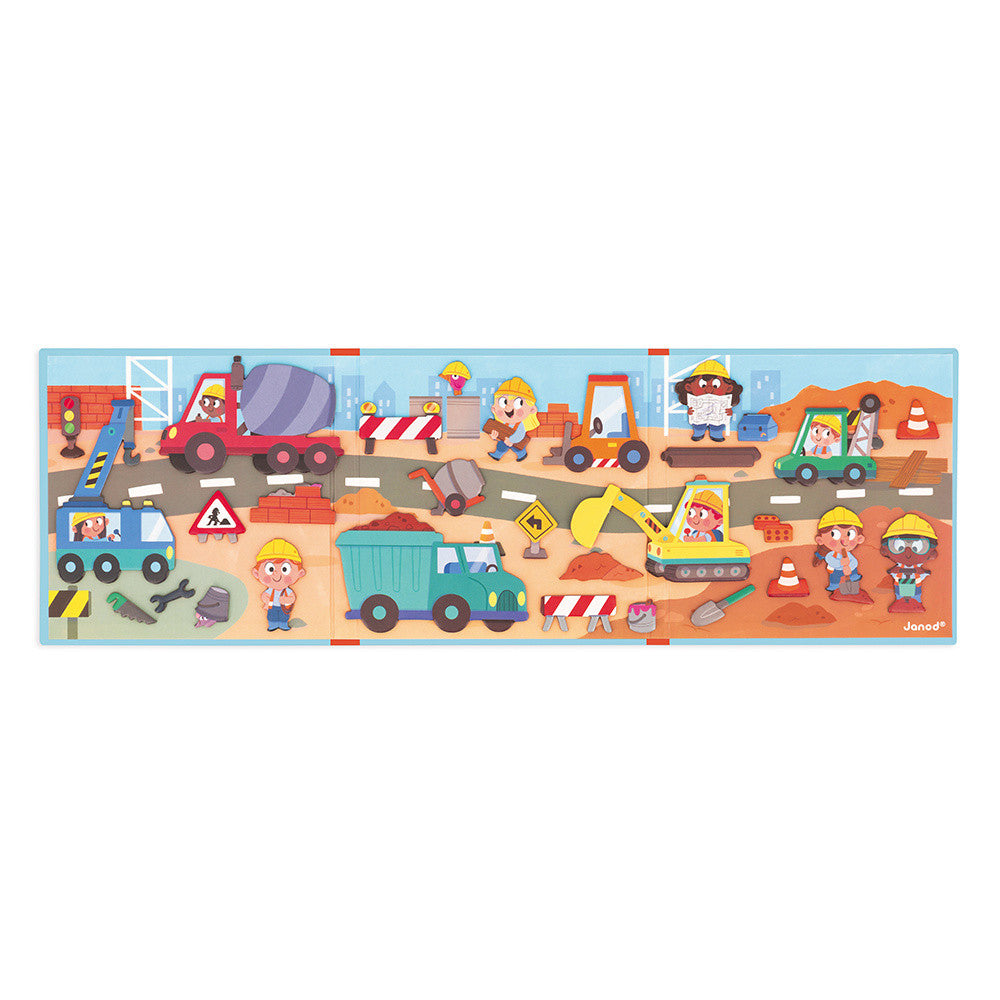 30 magnetic pieces featuring construction vehicles and characters. Foldable magnetic board for easy setup and portability.