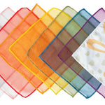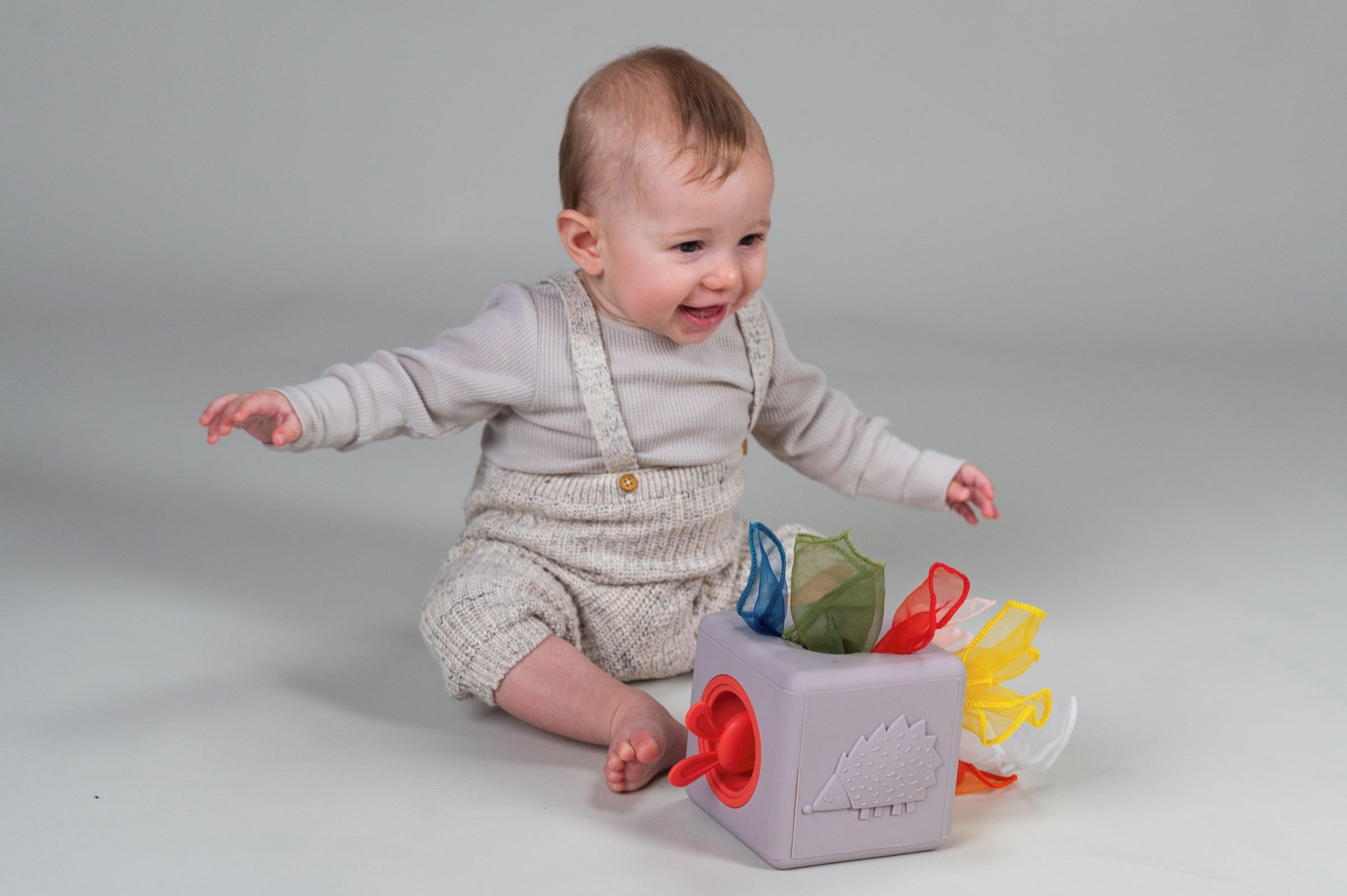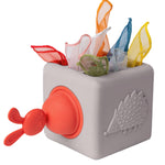 1 soft silicone tissue box with sensory features (peek-a-boo bunny, textured hedgehog, and pull-through grid) and 10 colourful fabric tissues (8 shimmering organza and 2 ultra-soft peach textures).