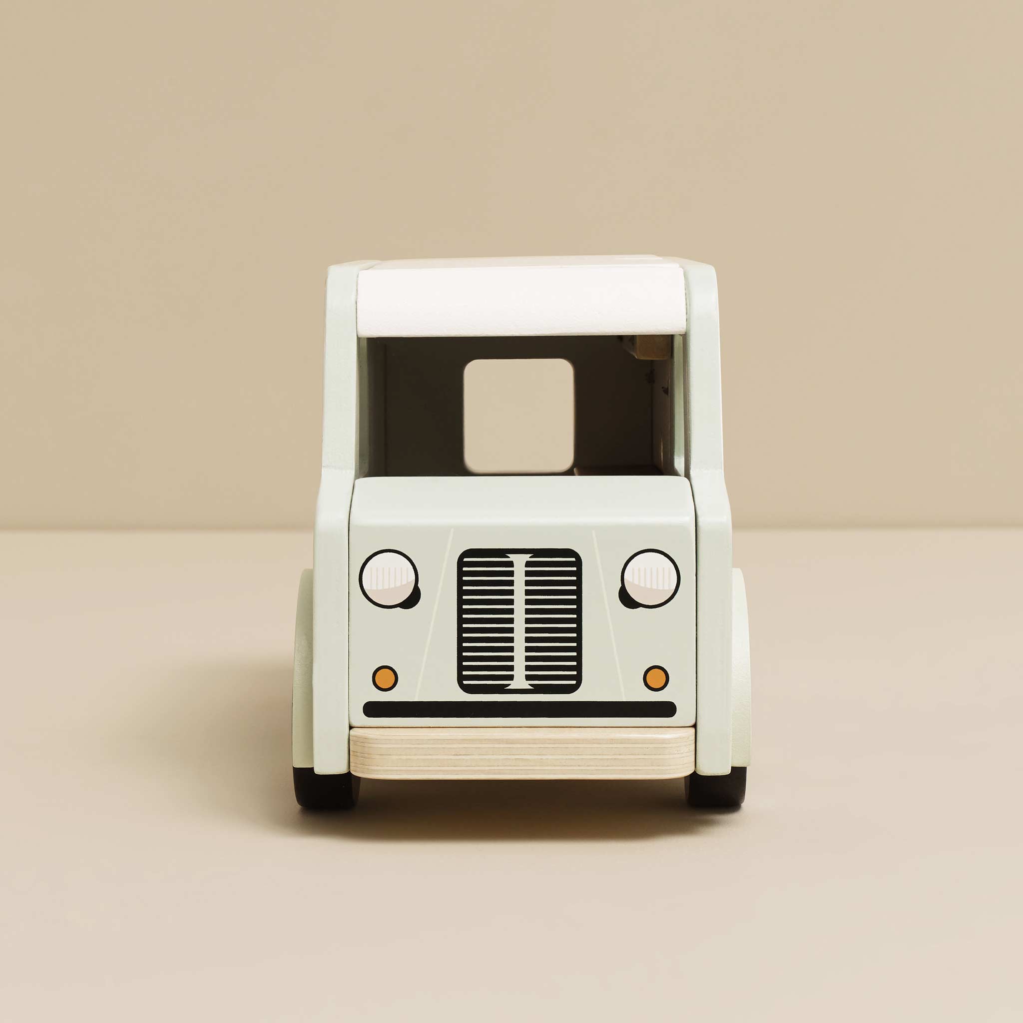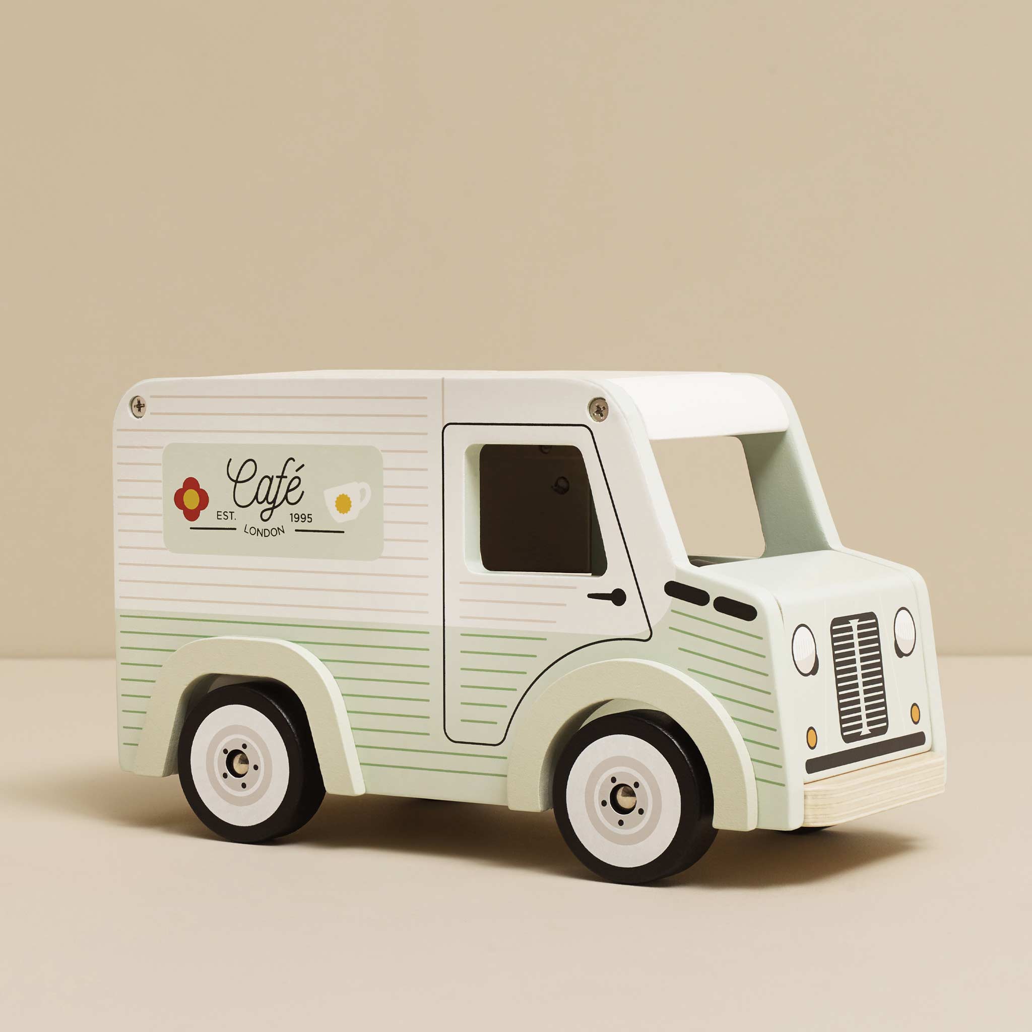 Painted in a nostalgic pistachio green and white, the van features intricate artwork on all sides. The flip-open roof reveals a coffee and tea menu display board, while the front-opening service hatch allows children to role-play as café owners, taking orders and serving delicious drinks and treats. The set includes a serving tray with a coffee mug and croissant, providing everything needed for hours of engaging pretend play.