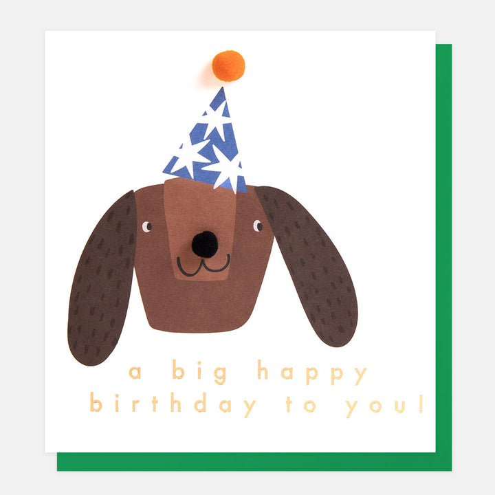 Make any child’s birthday extra special with the A Big Happy Birthday To You! card, featuring an adorable dog character dressed up in a festive party hat. This fun and playful design is embellished with vibrant pom poms, adding a unique and tactile element that kids will love. Perfect for celebrating birthdays, this card comes with a striking green envelope, making it stand out from the moment it’s received.