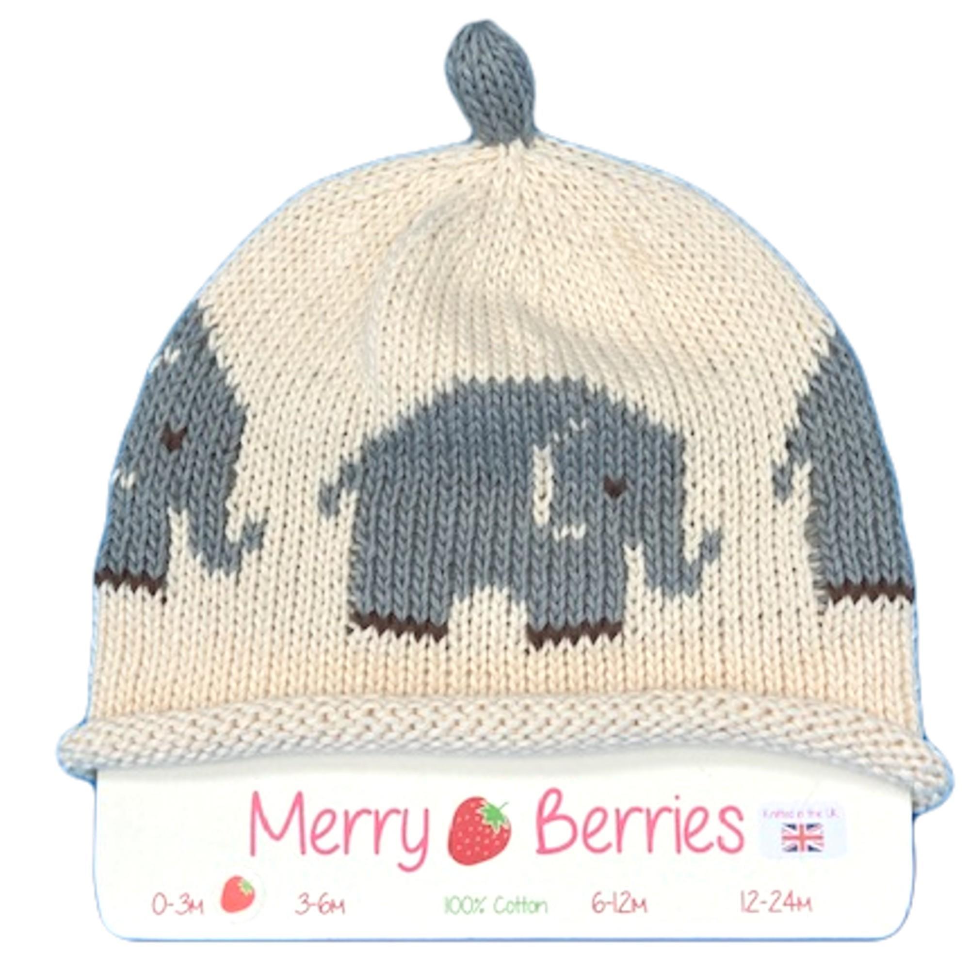 Your little one will look adorable in this Merry Berry elephant knitted hat. Whilst elephants run around the hat the contrasting bobble on the top makes the perfect finishing touch. The hats are 100% soft cotton cosiness and available in three sizes from newborn to one year. Also, they are a pure British product, knitted in the UK on domestic machines and finished by hand. A great new baby or baby shower gift – even if you’re not sure if it’s a boy or a girl!