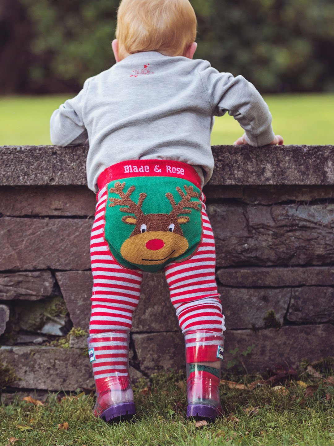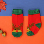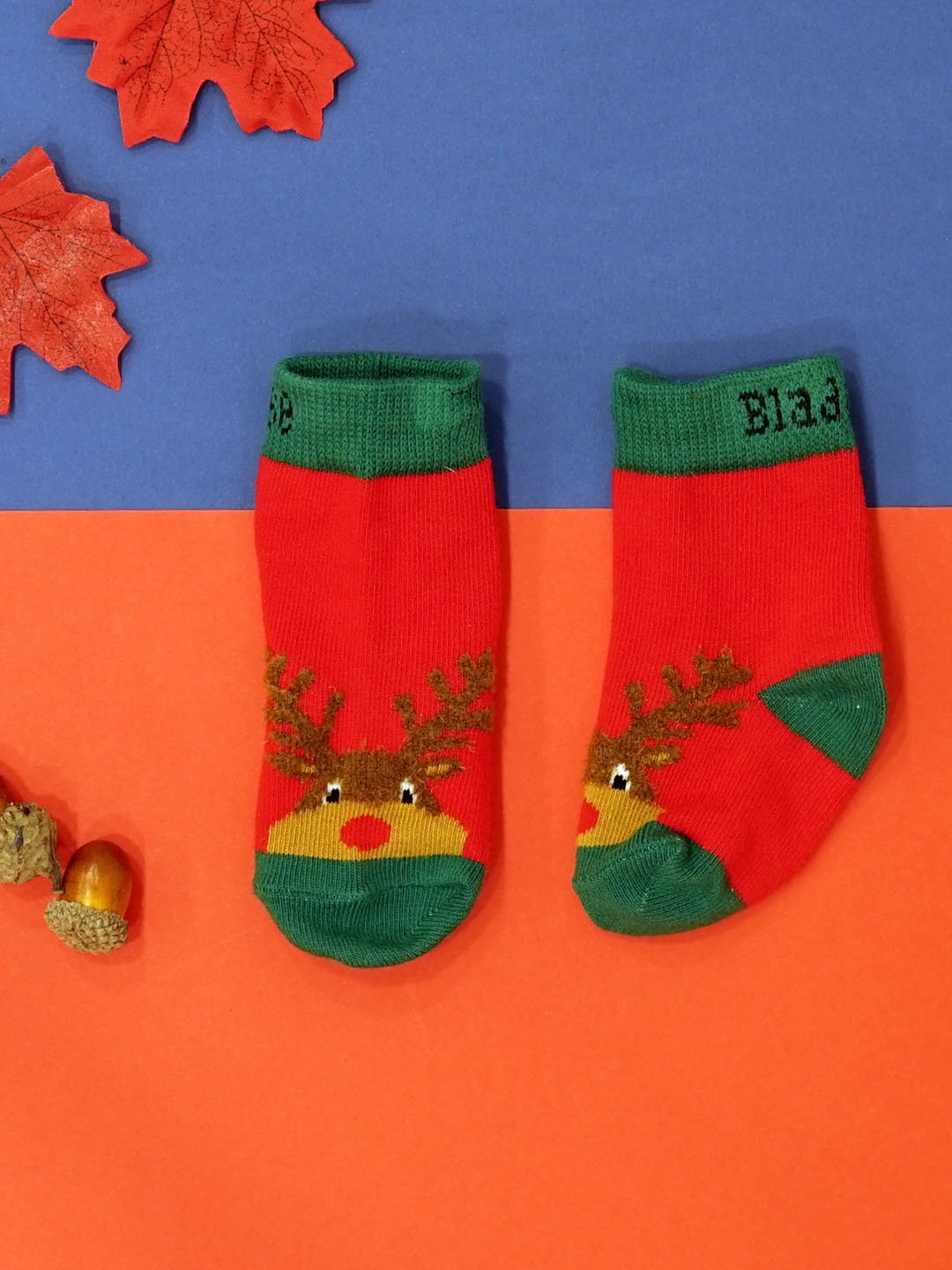 Add a touch of festive cheer to every step with our Festive Rudolph Socks! These adorable red socks feature contrasting forest green toes, heels, and ankle cuffs, complete with a sweet Rudolph face on the front. The fluffy knit detailing on his antlers adds an extra dash of seasonal magic — perfect for keeping tiny toes cosy all winter long!