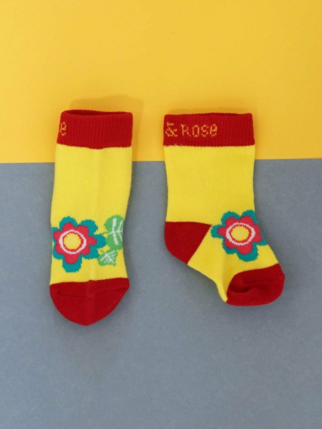 Gorgeous floral garden socks are a contrasting bright yellow with a spring flower on the feet.
