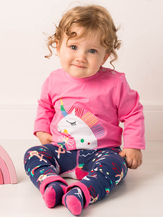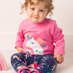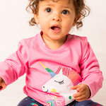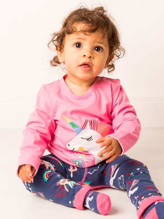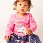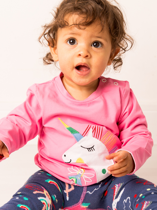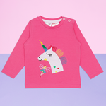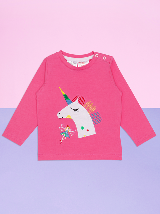 This bright pink top features an adorable Unicorn print on the front, with a fairy flying by it's side, adding a touch of whimsy and fun to this adorable piece of clothing.