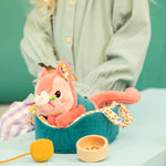 A soft little Jeanne cat tucked in her cosy fabric basket, ready for gentle play anywhere.