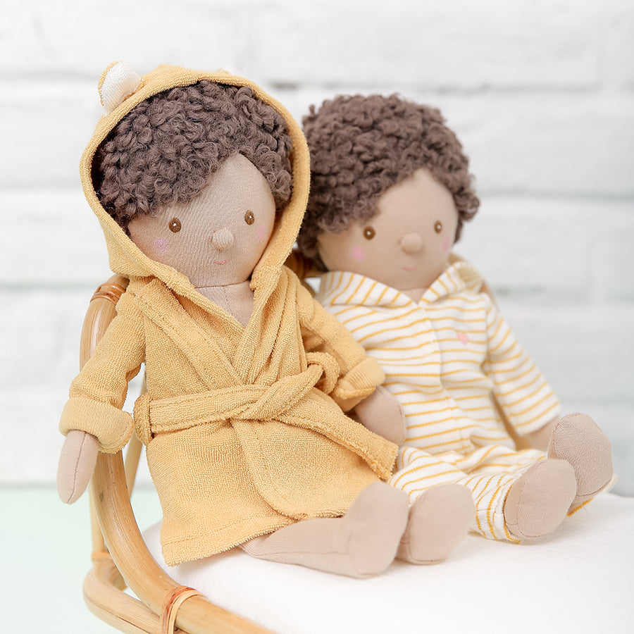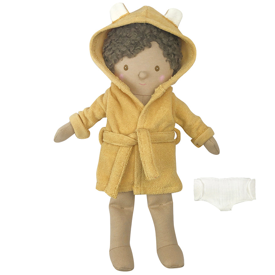 The Wild Lion Set Baby Doll is an adorable, snuggly companion designed to capture little hearts. With its soft floppy head, embroidered bellybutton, hand-painted rosy cheeks, and sweet button nose, this doll is perfect for cuddles and play. Dressed in a removable mustard yellow muslin lion dressing gown and matching muslin nappy, children will love dressing and undressing their new friend. Parents appreciate its safe, high-quality design and the way it encourages both imaginative and practical play, making it a timeless gift for little ones.